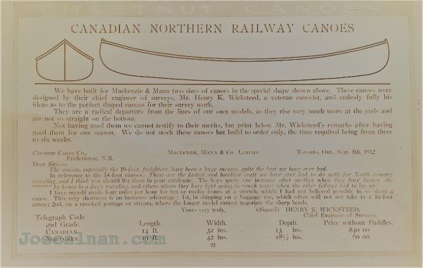 Henry Wicksteed's 1911 James Bay Railway Travelling Canoe design. Produced by Chestnut Canoe company from 1913 to 1921 as the 14-foot Canadian Northern Railway Canoe.
